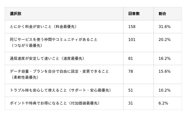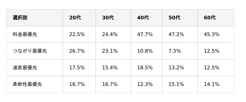 全体では「料金の安さ」が31.6%で1位ですが、20代は「コミュニティ」(26.7%)が「料金」(22.5%)を上回る結果に。40代以上は「料金最優先」が約半数を占め、年代による価値観の違いが鮮明です。