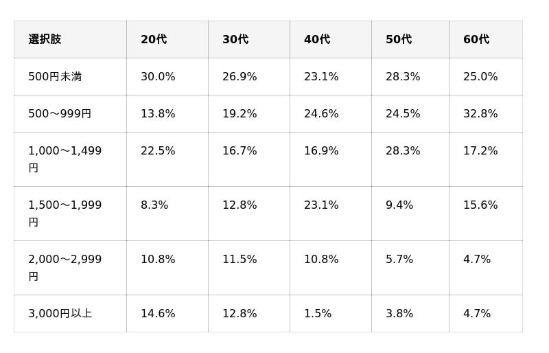 20代の「3,000円以上」が14.6%と他年代より高く、快適さへの投資意欲がうかがえます。一方、60代は「500~999円」が32.8%で最多となり、年代が上がるほど節約志向が強まっています。