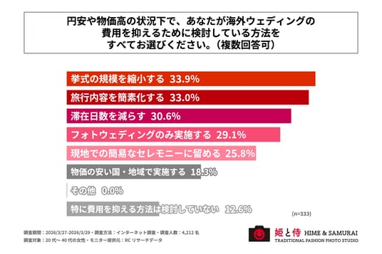 また、海外ウェディングを希望する女性を対象に「円安や物価高の状況下で、海外ウェディングの費用を抑えるために検討している方法」を尋ねる設問への回答では、1位が「挙式の規模を縮小する」で33.9%、2位が「旅行内容を簡素化する」で33.0%、3位が「滞在日数を減らす」で30.6%という結果になりました。この結果から、円安や物価高の状況下、海外ウェディングの費用を抑えるために検討している主な方法は、「挙式の規模を縮小すること」や「旅行内容を簡素化すること」であることがわかりました。