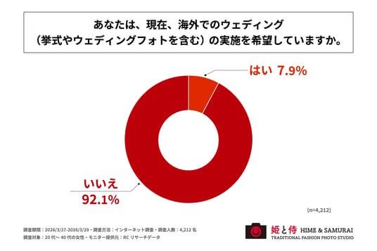 まず、「現在、海外でのウェディング(挙式やウェディングフォトを含む)の実施を希望しているか」を尋ねる設問への回答では、「いいえ」が92.1%、「はい」が7.9%という結果になりました。この結果から、20代~40代の女性の約1割が、現在、海外でのウェディングの実施を希望していることがわかりました。