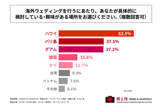 調査の最後、海外ウェディングを希望する女性を対象に「海外ウェディングを行うにあたり、具体的に検討している・興味がある場所」を尋ねる設問への回答では、1位が「ハワイ」で62.5%、2位が「バリ島」で37.5%、3位が「グアム」で37.2%という結果になりました。この結果から、海外ウェディングを行うにあたり、具体的に検討している・興味がある場所で最も多いのは、「ハワイ」であることがわかりました。