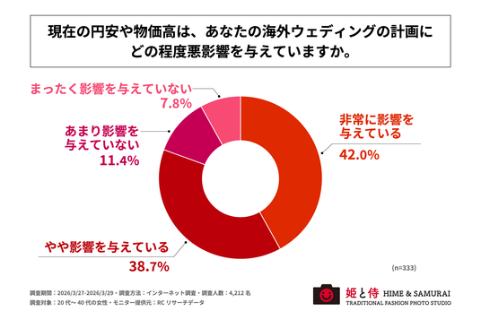 海外ウェディングを希望する女性の8割以上が、現在の円安や物価高は海外ウェディングの計画に「悪影響を与えている」と感じている