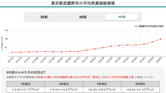 武蔵野市は、大規模な再開発によって価格が上昇しているエリアではなく、既存の住環境と需要の強さによって価値が維持されている住宅地です。