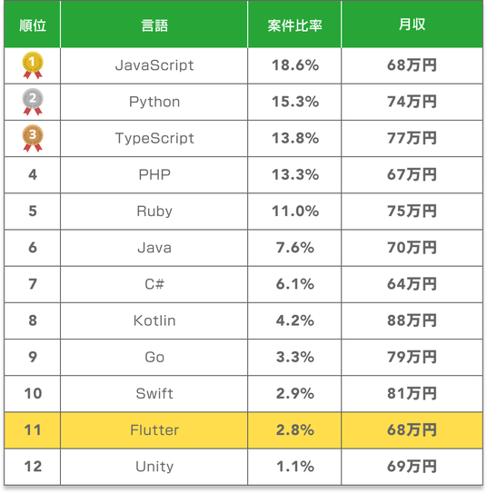 Flutterは比較的新しい技術のため、JavaScriptやPHPといった定番言語と比べると案件数は限られます。ただし、クロスプラットフォーム開発の需要増加に伴い、案件数は年々増加傾向にあります。