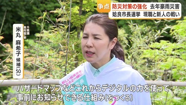一方の米丸氏は、災害時に「自分には何の立場もなく、ボランティアをしたがほんのちょっとしか助けることができなかった」という悔しさを原点に、市役所だけに頼らない防災の仕組みづくりを提案する。「地域の皆さんの絆をしっかり連絡などをとれる体制をつくっていきたい。ハザードマップなど、デジタルの力を使って事前にお知らせできる仕組みをつくる」と訴える。