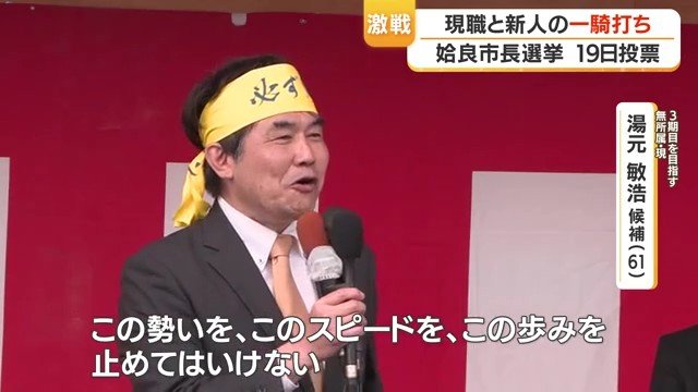 元テレビ局社員という異色の経歴を持つ現職の湯元敏浩氏は、出陣式で支持者にこう訴えた。