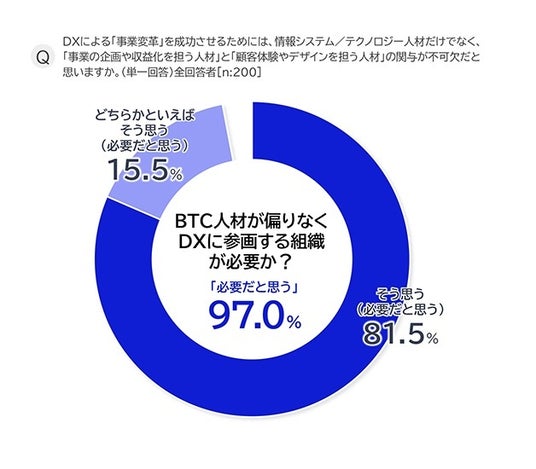 事業変革推進における課題の1位は「DX推進のための人材不足(76.5%)」ですが、その背景には既存事業部門の抵抗や協力不足、縦割り組織の壁があります。解決の鍵として、ビジネス(B)、テクノロジー(T)、クリエイティブ(C)の3つの視点を持つ人材が偏りなく連携する「三位一体」の組織体制が求められており、97.0%の企業がその必要性を実感しています。さらに、「組織・人材の設計」「組織文化の改革」「ビジネスモデルの再設計」を一体として進める構造改革が不可欠です。95.5%の企業がその必要性を実感しています。