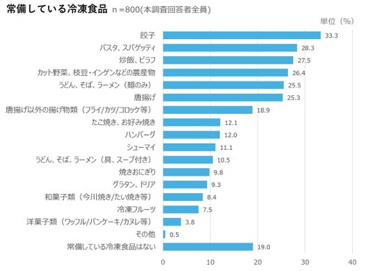 ■常備している冷凍食品ランキング<全体>冷凍庫に常備している冷凍食品(n=800)を尋ねたところ、直近3カ月以内に冷凍食品を購入したことがある人のうち、常備している冷凍食品がある人は8割を超えた。具体的な常備率については、「餃子(33.3%)」が最も多く、次いで「パスタ、スパゲッティ(28.3%)」、「炒飯、ピラフ(27.5%)」と続いた。