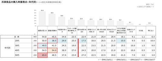 さらに、「国内生産であるか」は年代が上がるにつれ高く、冷凍食品の購入においては、年代とともに価格や品質、安全性といった点への関心が高まる傾向がうかがえる。