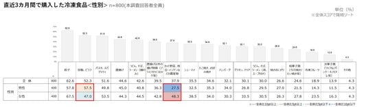 直近3カ月で購入した冷凍食品<性別>(n=800)