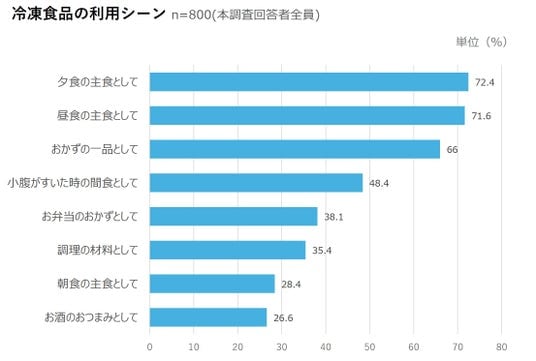 冷凍食品の利用シーン、「夕食の主食」「昼食の主食」がともに7割越え