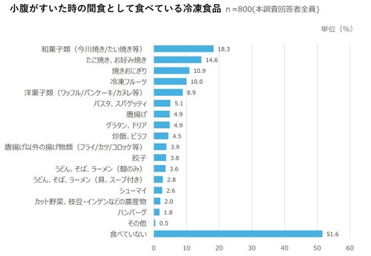 小腹がすいた時の間食として食べている冷凍食品(n=800)をみると、「和菓子類(今川焼き/たい焼き等)(18.3%)」が最も多く、次いで「たこ焼き、お好み焼き(14.6%)」、「焼きおにぎり(10.9%)」と続いた。さらに、「洋菓子類(ワッフル/パンケーキ/カヌレ等)(8.9%)」が5位に浮上しており、他の利用シーンでは下位であったお菓子系の冷凍食品が、間食としては上位に選ばれていることがわかる。