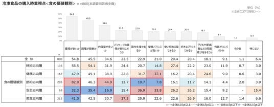 冷凍食品の購入時重視点<食の価値観別>(n=800)