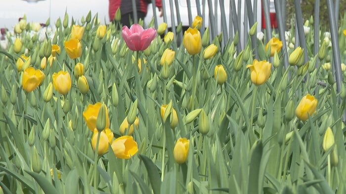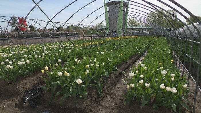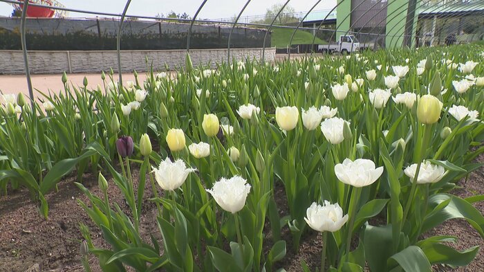 気温の高さはチューリップの生育を押し進めた。ネットを外した現時点で、すでに開花しているチューリップもみられる。チューリップは咲き始めてからおよそ1週間から10日間が見頃とされており、今後もさらに気温が上昇する予報が出ていることから、開花のピークが早まる可能性がある。