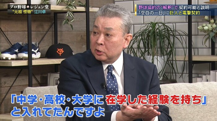 で、条文が変えられたのを見せられて、コミッショナーが夏にですね、それまで「浪人」というのがいなかったので、浪人というのを、「中学・高校・大学に在学し」と書いてあるんですよ、それまでの条文は。「在学し、ドラフトを受けなかった人が新しいドラフトをされる」と書いてある。