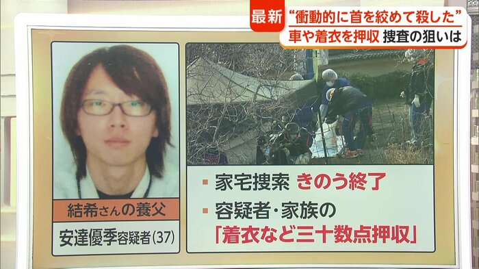 警察が安達容疑者が運転していた車のドライブレコーダーを調べたところ、データの一部が消されていた。結希さんが行方不明となった3日後の3月26日、安達容疑者の自宅を家宅捜索する様子をカメラが捉えていた。