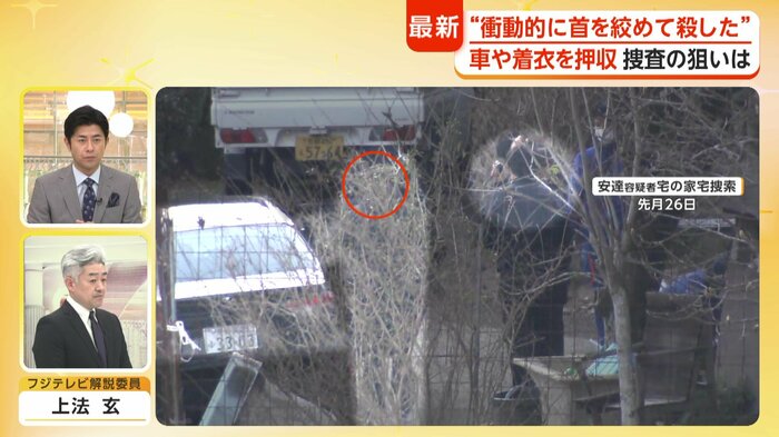 さらに場所については最初の遺棄現場で殺害したと話していることも明らかになっている。安達容疑者の供述について、フジテレビ報道局の上法玄解説委員は「突然、衝動的にカッとなって殺意が芽生えたかのような話をしているんですが、現場の状況あるいは遺体の状況と合致するのかどうか、今後の入念な捜査が待たれるところです」と述べた。