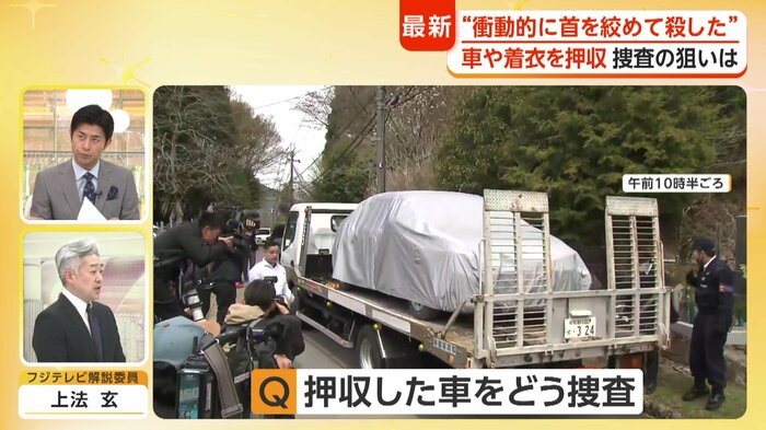 押収された車でどのような捜査を行うのか問われると「この車が少なくとも遺体を運んだ証拠となる可能性は極めて高い。そうなるとこの車を使って犯人である父親に実際どのように遺体を運んだのか、運び入れたのか、運び出したのか、再現させてしっかり証拠を押さえていく必要がある」と述べた。