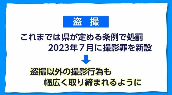 以前は都道府県が定める条例での処罰だったが、2023年には「撮影罪」が新設され、盗撮行為そのものはもちろん、撮影した画像や動画を第三者に「提供」する行為、さらにそれらを「保管」する行為も処罰の対象となった。