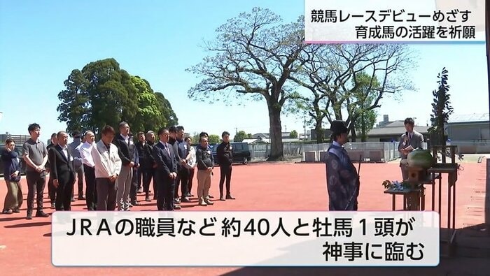 宮崎市にあるJRA宮崎育成牧場の厩舎前で、育成馬の安全と今後の活躍を祈る神事が執り行われた。