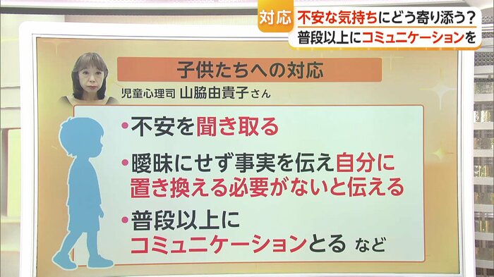 では、実際に変化やニュースについて子供から聞かれた場合について山脇氏は「何よりも大事なのは安心感を高めること、子供が不安を口にしたらじっくり聞き取ること」さらに聞かれたことについて「曖昧にせずニュースに関する事実も伝えた上で自分に置き換える必要はないと伝えること、普段以上にスキンシップやコミュニケーションを取ることなどが大事」だという。