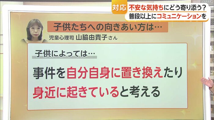 事件の取材で子供が「怖い」と口にしているという場面も見られた。山脇氏によると「子供によっては事件を自分自身に置き換えたり身近に起きていると考える」という。