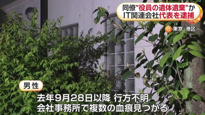 2025年から行方不明になっている東京・港区のIT関連会社の男性役員とみられる遺体を遺棄した疑いで、代表の男が逮捕された。