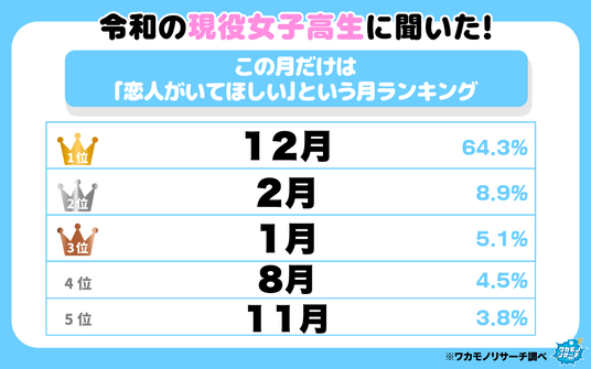 まず、全国の女子高生行った「この月だけは恋人がいてほしい月はいつですか?」というアンケート調査結果をランキングで見てくと、