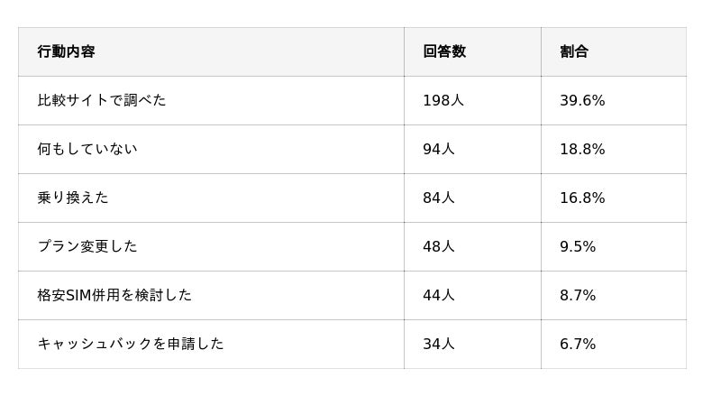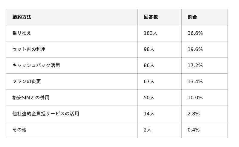 2位の「セット割の利用」(19.6%)、3位の「キャッシュバック活用」(17.2%)と比べても、「乗り換え」はダブルスコアに近い差をつけています。