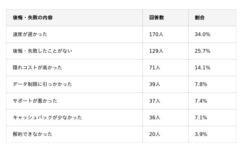 後悔・失敗の理由では、「速度が遅かった」に次いで「隠れコストが高かった」(14.1%)、「データ制限に引っかかった」(7.8%)が続いています。