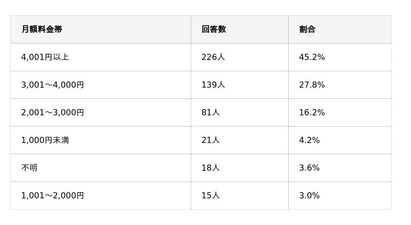 現在の月額料金を聞いたところ、「4,001円以上」が45.2%で最多でした。3,001円以上を支払っている人の合計は73.0%に達しています。