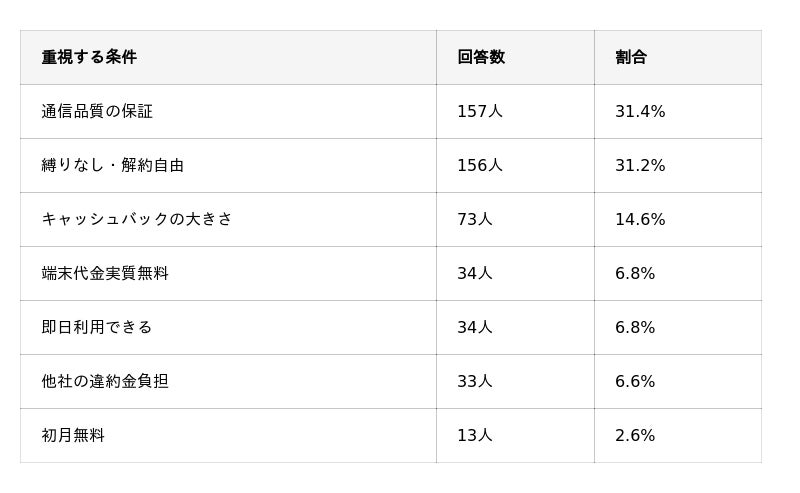 後悔理由の調査では「速度が遅かった」が1位だったことを踏まえると、安さだけで選んで後悔した経験が、次の乗り換えでは「品質」と「縛りなし」を重視する意識につながっている可能性が高いと考えられます。