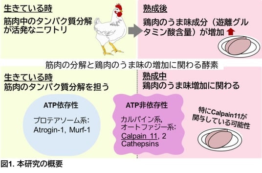 - ニワトリの筋肉におけるタンパク質分解レベルが、熟成後のむね肉のうま味成分(遊離グルタミン酸)の蓄積に関与することが分かりました。
