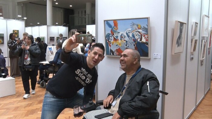 イギリス・ロンドンで15日、口や足で描くアーティストたちの活動を支える団体MFPAの設立70年を記念した展覧会が開かれた。会場には33カ国以上の作家による150点ほどの作品が並んだ。