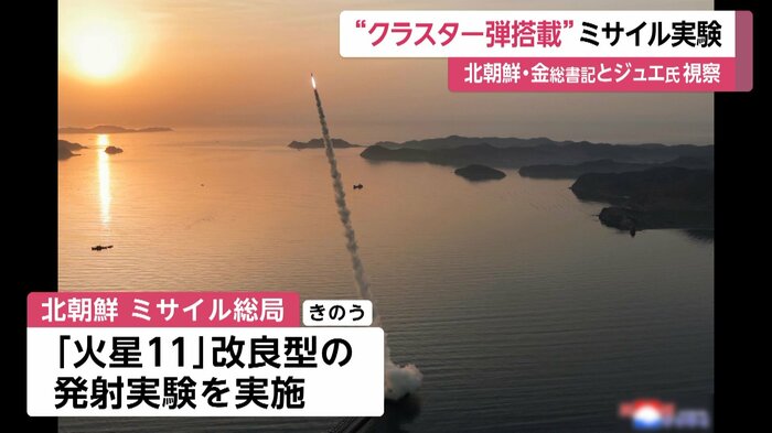 北朝鮮の金正恩総書記は19日、短距離弾道ミサイルの発射実験を視察した。国営メディアによると、改良型「火星11」5発が発射され、広範囲を攻撃できるクラスター弾を搭載していたとみられる。金総書記は実験の成果を強調し、軍事的意義を評価した。