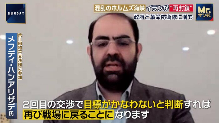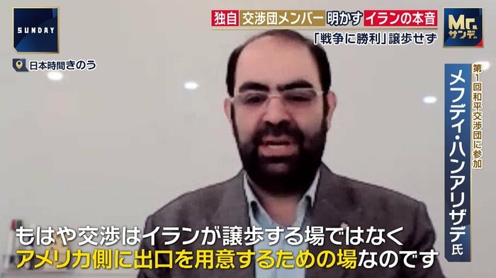 停戦期限が迫る中、イランとアメリカによる2回目の和平交渉の行方が注目されている。イラン側の交渉団の1人として同行したテヘラン大学のメフディ・ハンアリザデ教授が、日本のメディアの取材に初めて応じ、内情などを語った。