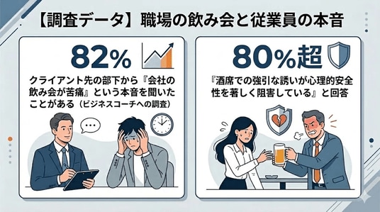 さらに同様に、8割超のコーチが、「酒席での強引な誘いが、職場の心理的安全性を著しく阻害している」と警鐘を鳴らしています