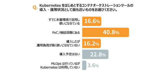 - Kubernetesをはじめとするコンテナオーケストレーションツールを本番環境で活用し、使いこなせている企業は2割を下回る。「PoC/検証段階にある」(40.8%)、「導入したが運用負荷が高く使いこなせていない」(16.2%)など、実運用には課題が残る。