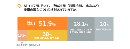 こうした背景から、液体冷却技術への関心も高まっています。液体冷却技術の導入状況について、「導入を決定・実行している」(13.9%)、「本格的に検討中」(38.1%)と、半数以上の企業が導入、または導入を検討していることが明らかになりました。