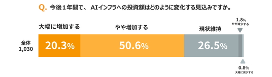 - AI活用の拡大に伴い、企業のAIインフラ投資は増加傾向に。約7割が、今後1年間においてAIインフラ投資の増加を見込んでいると回答。