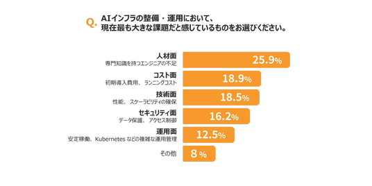 - AIインフラ導入・運用における課題は、多層的。中でも1位は「人材面」(25.9%)、2位「コスト面」(18.9%)、3位「技術面」(18.5%)、4位「セキュリティ面」(16.2%)と続く。