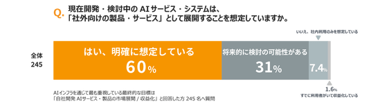 この結果から、AIインフラは単なるIT基盤ではなく、企業のAI活用戦略を支える重要な経営投資として位置づけられつつあることがうかがえます。実際に、AIを活用したシステムについて、「社外向けの製品・サービスとして明確に想定している」と回答した企業は60.0%に達しました。また、「将来的に検討の可能性がある」と回答した企業も31.0%に上り、9割以上の企業がAIを社内の業務効率化にとどまらず、製品・サービスとして社外へ提供する可能性を視野に入れていることが分かりました。こうした動きから、AIインフラへの継続的な投資が企業競争力の重要な要素になりつつあると考えられます。
