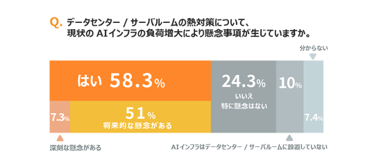 データセンターやサーバルームの熱対策については、「深刻な課題となっている」「将来的な懸念がある」と回答した企業の合計が58.3%に達し、約6割の企業が発熱対策を課題として認識していることが分かりました。