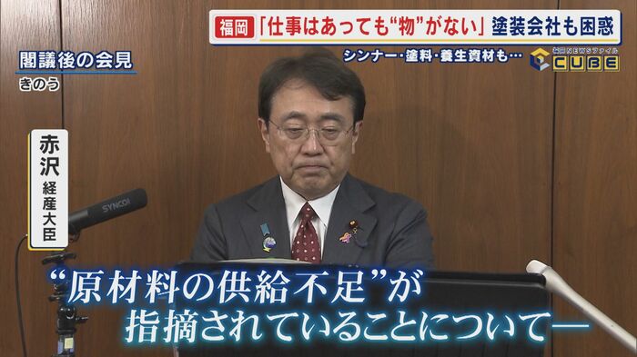 赤沢亮正・経済産業大臣は、閣議後の会見で、多方面で原材料の供給不足が指摘されていることについて「目詰まりや偏りが生じたという連絡があれば直ちに対応する。経産省や各省に声を届けてもらえれば、数日以内に目詰まりが解消する、その見込みが立つことになっている」と述べた。