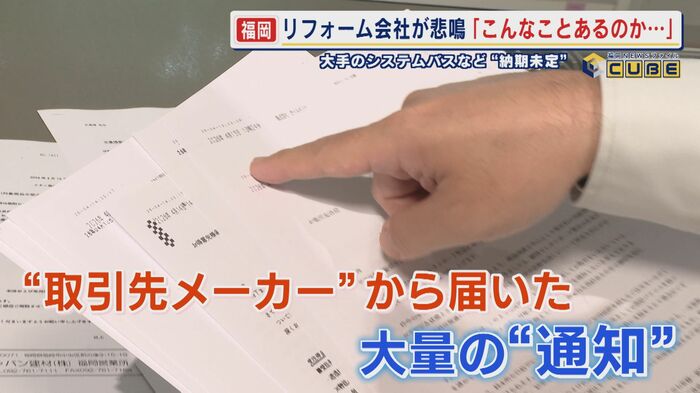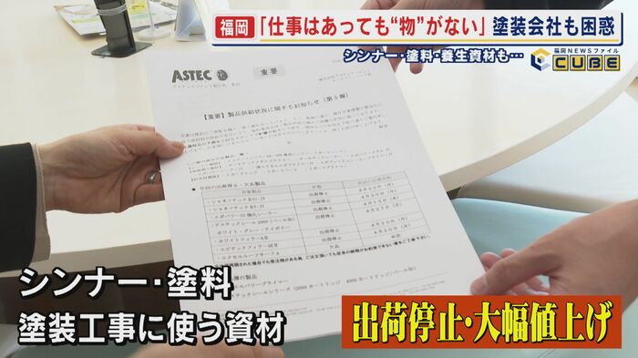一方、石油製品の供給目詰まりは、深刻さを増している。福岡・朝倉市を中心に住宅のリフォームなどを手掛ける『古賀組』。営業部長の井上裕一郎さんから見せてもらったのは、取引先のメーカーから届いたという大量の通知。全て”新規受注の見合わせの件”だ。