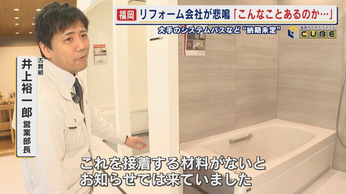 井上営業部長は「ユニットバス。面材のフィルムが貼ってあるんですけど、これを接着する材料、接着材がないということが、各社からの“お知らせ”で来ていました。こんなことあるのかな、すごいことになったなという感じです」と驚きを隠せない。