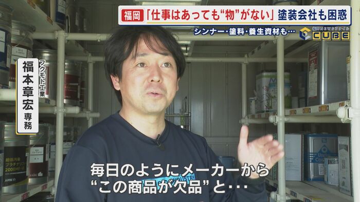 福本専務は「いま不足しているシンナーは、塗料の仕上がりが、きれいになるように少し混ぜるんですけど、欠品が続いていて、注文すらできない。また“水性”の下塗り材は当初、影響が殆どないだろうと予測していたが、いま出荷停止で…」と話す。ナフサ由来の油性塗料の不足を受け、代替品とされる水性塗料も出荷停止となっているのだ。