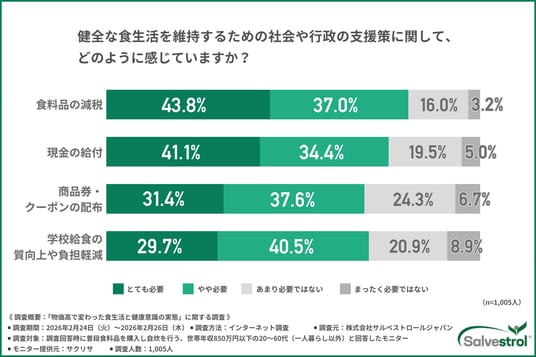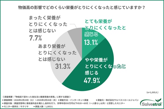 株式会社サルベストロールジャパン(所在地:東京都渋谷区)は、物価高の影響を実感している世帯年収850万円以下の20~60代(※一人暮らしを除く)を対象に、「物価高で変わった食生活と健康意識」に関する調査を実施しました。