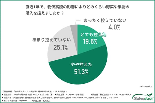 「物価高騰の影響で野菜や果物の購入を控えたか」という質問では、約7割(とても控えた :19.6%、やや控えた:51.3%)が野菜や果物の購入を控えていると回答しました。