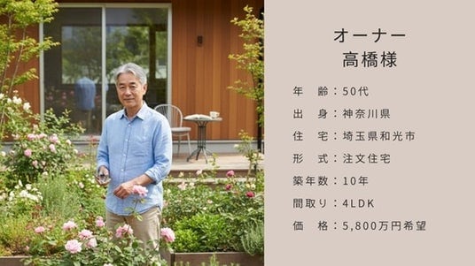 - 検証は、オンライン調査環境で、首都圏に在住する20-60代の900人を対象としたランダム化比較試験を採用しました。環境配慮群にはサステナビリティ(図1)、ストーリー群には花が好きな前オーナー様の「自宅で花を楽しむ」こだわり(図2)を提示しました。物件の内容に差はつけないために、前オーナー様(図3)と物件(図4)の情報は両群で共通に使用しました。その結果、環境配慮よりもストーリーを訴求する方が中古住宅の魅力が高まることが確認されました。同じ物件情報であっても、冒頭での際立たせ方によって価値が変動することを実証しました(図5)。